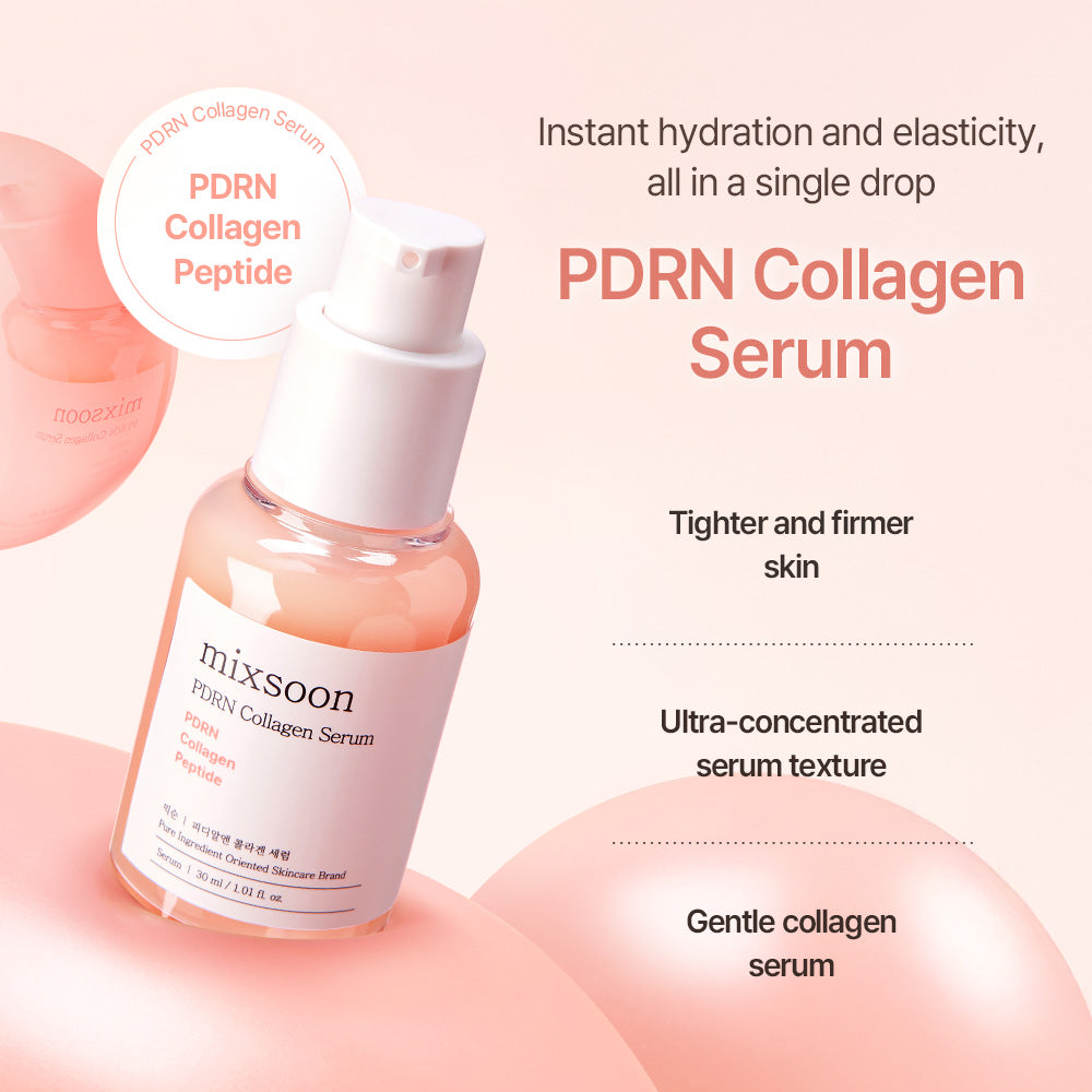 mixsoon PDRN Collagen Serum is a moisture-boosting, firming serum that combines plant-based PDRN, collagen, and peptides to help restore skin elasticity and vitality. This triple-function formula delivers deep hydration while supporting the skin barrier and refining texture. Its high-viscosity yet fast-absorbing texture glides smoothly onto the skin, leaving it plump, bouncy, and dewy without a sticky finish. Enriched with rice-derived ferment and low-molecular hyaluronic acid, the serum helps brighten and hydrate the skin from within. Gentle and non-irritating, it is suitable for sensitive, dry, or dull skin types looking to improve overall resilience and radiance through a daily firming routine.